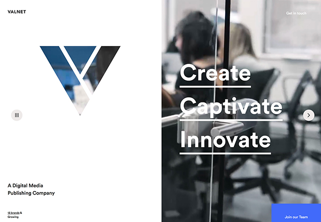 這個月的最后一個趨勢對所有業余印刷工來說都很有趣。設計人員選擇填充類型(或創建層,以復制圖像填充的外觀),并使用厚塊樣式的字母。雖然這個觀點并沒有什么特別的新意,但對這個概念的解釋卻是。下面的三個例子都使用了一些文本填充的移動圖像。在網頁左側的白色框架中,Valnet將其簽名“V”剪掉。在后臺,一個視頻循環播放。信中的圖像是背景中的視頻的一部分。這是一個很好的效果,讓設計師可以使用一個更垂直的框架,而不需要一個奇怪的視頻框架。最偉大的故事也使用了同樣的概念,但留給用戶更多的想象力。在背景中有視頻b-roll,但它實際上只在星形設計中創造了一種運動和色彩的感覺。它所做的是吸引用戶點擊并真正進入網站的設計和內容。