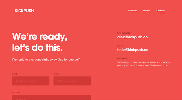 Kickpush讓他們的聯系頁面很容易找到,通過在他們的導航中直接顯示,而不是一些喜歡把他們的鏈接放在頁腳的網站。通過將他們的鏈接放置在導航中,并使用簡單的“接觸”字,他們就在猜測如何與他們取得聯系。