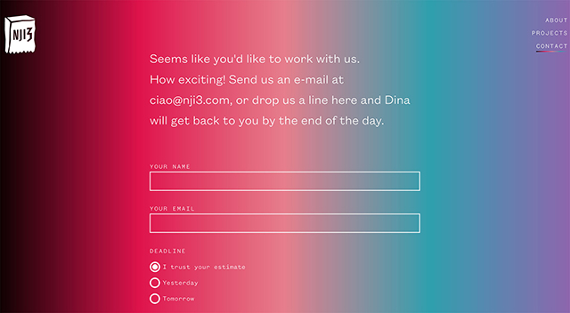你需要努力回答所有進入你網站的詢問。為了幫助你相信一個用戶的信息不會被忽視,你應該試著寫一些積極的確認,比如NJI3的所有的女孩設計三人組都在他們的聯系方式上。他們會讓你知道,如果你給他們發信息迪娜會在一天結束之前回復你。這迫使用戶采取行動,實際填寫聯系表格。