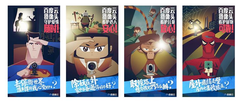 1. 百度云攝像頭的幾張大海報,幾個關鍵詞:隨時、安心、放心、可靠,海報中的人物都是家喻戶曉的superstar,并且整個頁面有一定的故事性和想象空間,讓人印象很深刻,并且調起了好奇心。