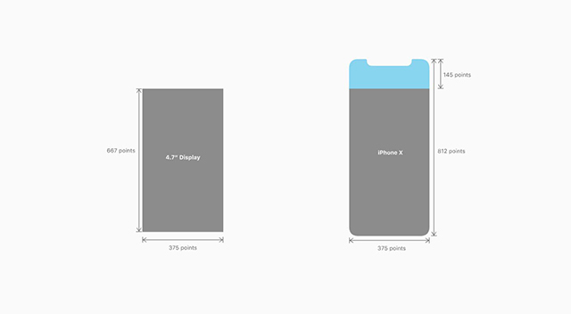 iPhone的X顯示尺寸為375pt寬度* 812 pt高。在3倍顯示中,這等于1,125 px @3倍寬度* 2,436 px @3倍高。在縱向方向上,iPhone X上顯示的寬度與iPhone 6、iPhone 7和iPhone 8的4.7英寸屏幕的寬度相匹配,因此所顯示的信息量與這些設備的窄尺寸沒有任何區別。但是顯示器有不同的高度:812pt的高度高出145pt,高達4.77t的4.7“。 這個額外的iPhone X高度為內容提供了20%的空間。