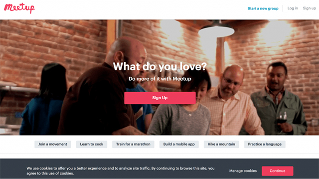Meetup的創始人也發現了他們的獨特定位——這個網站是為那些不僅想要交流,而且想要一起做一些事情的人而設立的。在這里,用戶可以找到一家學習語言、編程、培訓、看電影、烹飪、畫畫和其他一些很酷的東西的公司。可用的類別以塊的形式呈現,看起來像帶有短標題的圖片。這很有創意,也很方便,因為用戶不會把時間浪費在閱讀長標題上。除了一個標準的注冊程序,注冊Facebook和谷歌也是可能的。