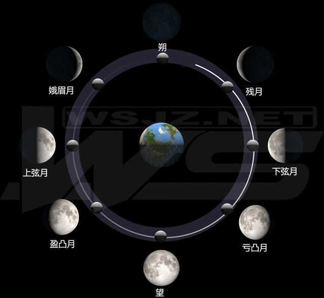 現實中的月相變化:朔、新月 峨眉月 上弦月 盈凸月 望、滿月 虧凸月 下弦月 虧眉、殘月