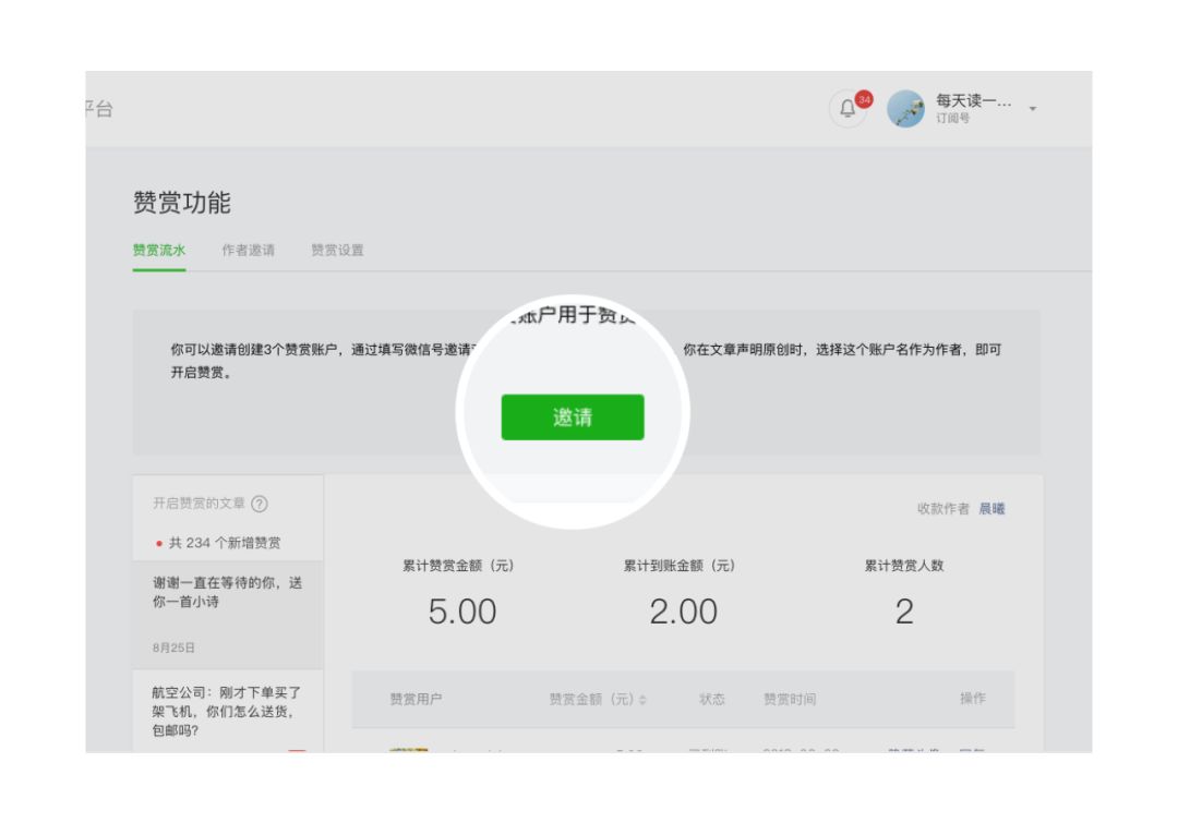 有邀請權限的公眾號在“贊賞功能”里填寫微信號發送創建邀請。